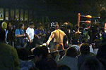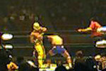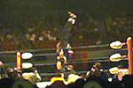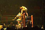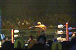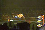 左:ものすごくキレイに技を決めてく技術系キッドと、プチ大仁田キャラな高井 右:登る福田・やられてるのはおそらくタイガース