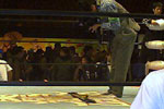 前半、ガンマが場外へダイビングしTAKAは後頭部を強打。