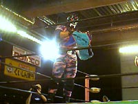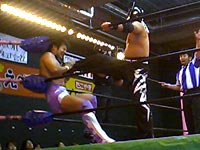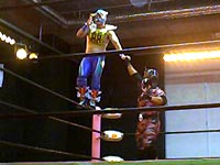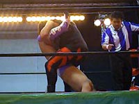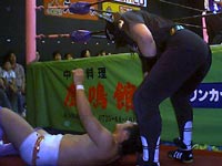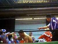 不思議な奇声を発してスウィングDDT。技はちゃんとしてました。プロです。が、会場大爆笑。