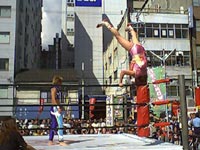 って、思ったら、コーナーポストで倒立。でもなんか開脚気味です。