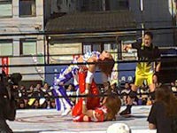 デビル(やったかな?)と永島。攻められっぱなしをなんとか返そうとウラカンするも、まったく倒れない。そのままお尻で潰す。