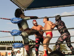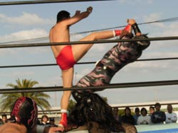 くいちゃん、カ○チョーを自ら身構えてたりとか、デルフィンにタッチしようとして足ひっぱられて、顔からベタッと落ちたりとかイッツキュー☆ト! ケイリンマスクもなんかいっぱいしゃべりながら。