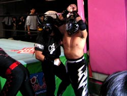 マグマとカルトをエプロンに座らせて、インフがダブルドロップキックしようとしたら、ゴアが阻止。