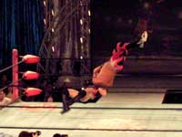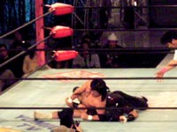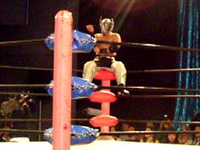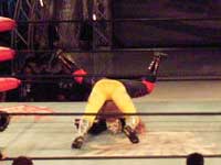 マグマ、STFな体勢(微妙にSTFじゃないねん)で締め上げて、コーナーに振って、串刺しボディプレス。