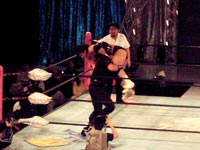 コーナーにあがったところを村浜が追いかけて、雪崩式ブレーンバスター。