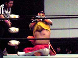 先制攻撃なバファロ、K−DOJOタオルでTAKAの首を締めあげる