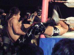 村浜の三角が決まり、丸藤は一時意識を失う。しかしそのまま自力で転がり、場外へ。場外カウントを待ちながら回復。