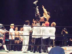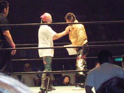 試合後、優勝した丸藤にキンキラキンジャンパーを着せる社長。