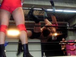 的場の頭突き、アルゼンチンが決まるも「あてがい」で、失神寸前に追い込み、そのまま男色ドライバー。