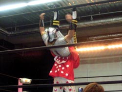 冨宅さんと長いこと攻防。その攻防の好きをねらって、タイガースがドロップキック。これで冨宅さんが落下。