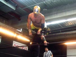 それをウラカンでかえそうとしたタイガースとの体勢が崩れかけて、でも持ち直して、コーナー際でパワーボム。見ててヒヤヒヤ。