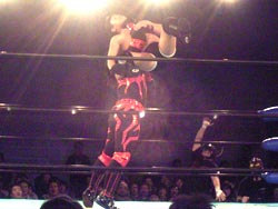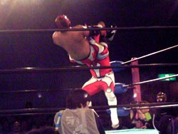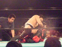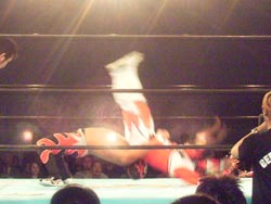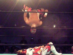 そのままの勢いで、ジャーマン、ムーンサルトと畳みかけようとするもライガに迎撃され、そのまま足四の字で絞り上げられる。