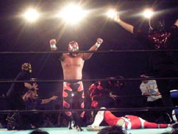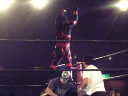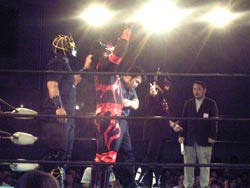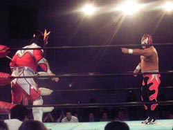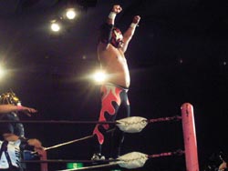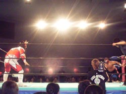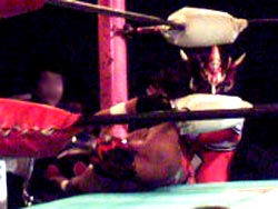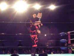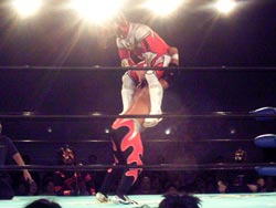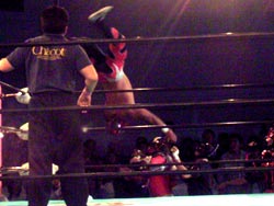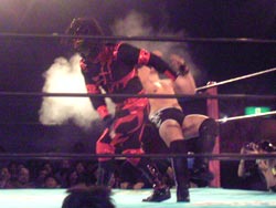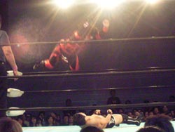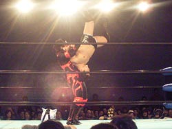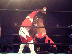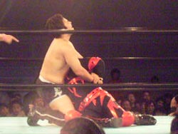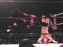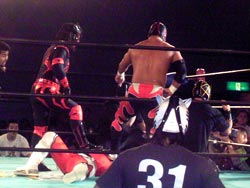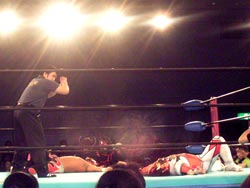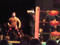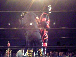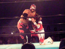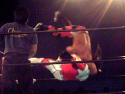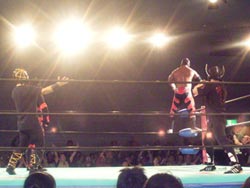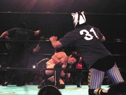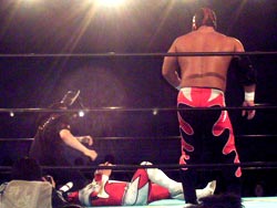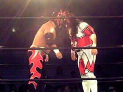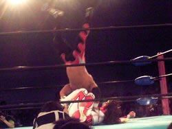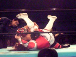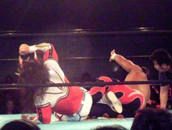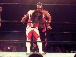 マグマ、攻め込むも、ライガーのあびせ蹴りで流れを変えられ、雪崩式ブレーンバスータ、ライガーボムでライガーの必勝パターンへもってかれる。