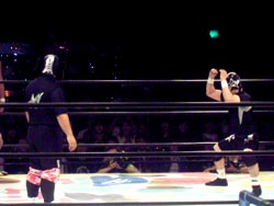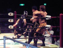 ほんでまた攻防があって、場外で武藤がデルフィンが痛めつけたり、カズにマスクをやぶかれて、変なとこから髪が出て、目の部分がズレてアレな感じなったりで、わちゃわちゃ。