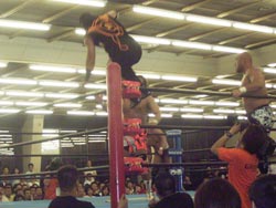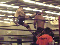 前の写真と同じなんちゃうよ、串刺しキック2回目を受けるTAKA もちろんまた吹っ飛んだ |