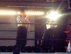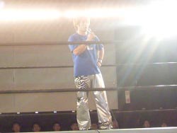 えべマイク「まぁ色々言われてますけど、結婚してもあれはあれ、これはこれやからね、福田!」「大丈夫です、そんなかわいいファンがいたらアレですから。だから福田ファンの女の子達も、これからも大阪プロレス見に来てよ!」