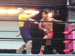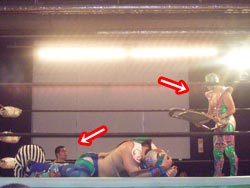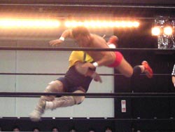 ペロ、的場をコーナーに振って串刺しボディプレス、ロープふって投げ落とし(上左の写真)。