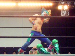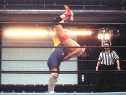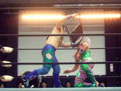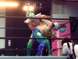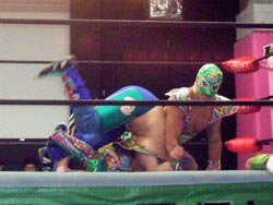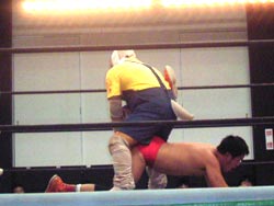 カメさんの反撃、フライングラリアットからコス脱いでピープルズセントーン(←勝手に命名)。