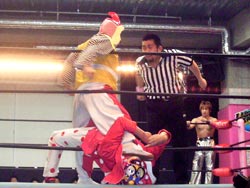 的場がロープワークからペロのラリアットを回避して、ランニングネックブリーカー。ペロが再度的場をロープ振って、ボディアタック、そこからビタワンバスターで3カウント。