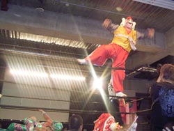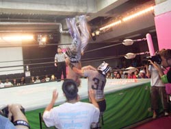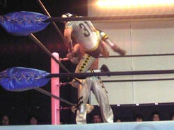 そのままデルフィンをコーナーに詰めてダブル攻撃。くいさんをふって社長にどかーん。続いてえべが行って、くいさんを丸め込み。