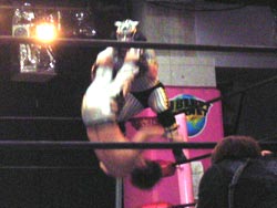 社長、くいさんにスウィングDDT狙うも、着地され、そこをえべにカンチョー。