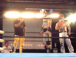 今度はくいさんと社長がダブル攻撃で、えべをコーナーにつめる。くいさんがどかーん。続いて社長がいって、くいさんを丸め込み。