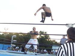タッチして、柿本と石倉、柿本が串刺しでドロップキック。