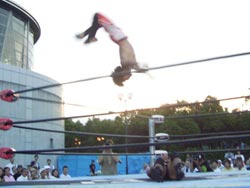 弁慶にぶちかまされて、場外へ逃げる谷口、そのままリング下へ。