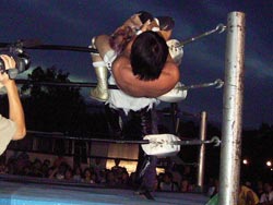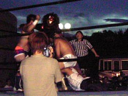 若作りチーム、お互い捕まえた相手を痛ませておいて、リング外周をぐるっと走って違う相手に頭突き。(説明ベタ)