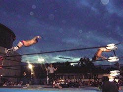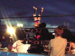 関本が起き上がりコーナーに上ったところをバファロも追いかけ、そのまま雪崩式ブレーンバスター。めっずらしーーー!