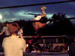 バファロ、場外へ逃げて倒れこむ。復活してリングイン。