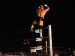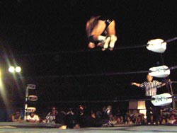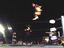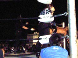 クロッチから井上を落とす。コーナーに吊るして低空ドロップキック。