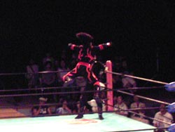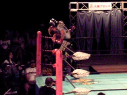 ユタカ返して、ネックブリーカ、コーナーに上りミサイルキック。