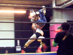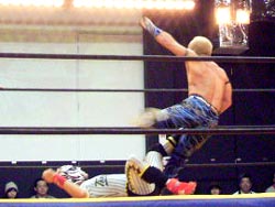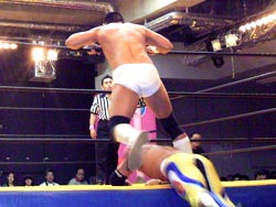 場外に落ちた的場がエプロンにあがった瞬間に、ビリーが股の間をすべり降りて、的場の足をすくう。エプロンに頭を打ちつけたかのようになった的場に、場外から走りこんでのドロップキック。