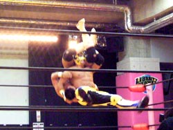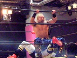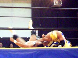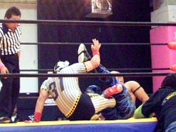 リング中央にひきずって、逆エビ。タイガースはよく曲がる。エスケープ成功。