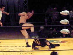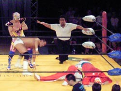 そして誤爆からえべが的場に蹴りかなんかを入れられて、くいさんのところへ倒れて、そのままくいさんがその上に倒れてフォール。