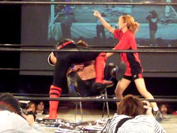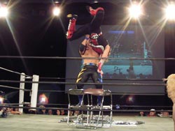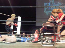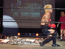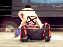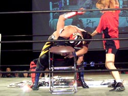 鳥羽が試合後に何故か椅子へ自爆ダイブ |