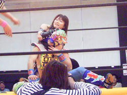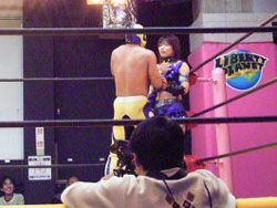 えーっと、どうなんでしょう。こういう仕事上(プロレス上:リング上)とは言え、可愛いレスラーのおっぱいムギューはそれなりに嬉しいもんなんですかねぇ。