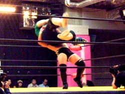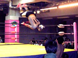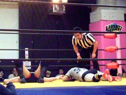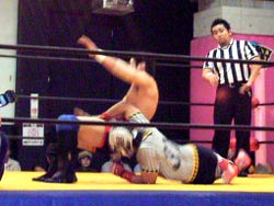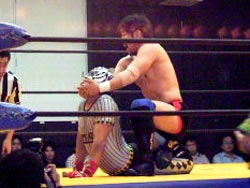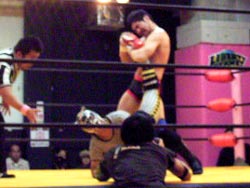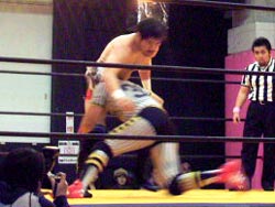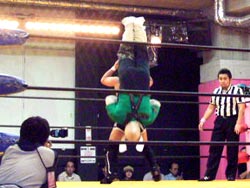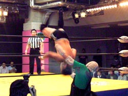 投げっぱジャーマン(バックドロップ?)でタイガースダウン。ぎりぎりカウント9でロープによりかかりながら立ち上がる。