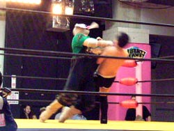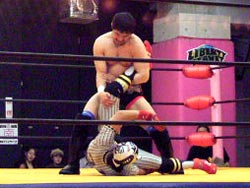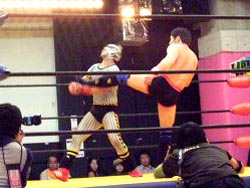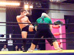 張り手対決から村浜がキックにいったところを、ペロが捕らえてドラゴンスクリュー。