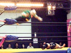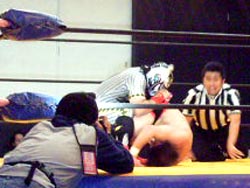 パワーボムの体勢に行くが、村浜が返す。ドロップキックでペロを場外へ出し、トペ。リングインして、ニールキック。