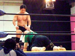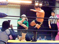 タイガースがバックドロップ、冨宅がハイキック、タイガースがドロップキックと一進一退の攻防。